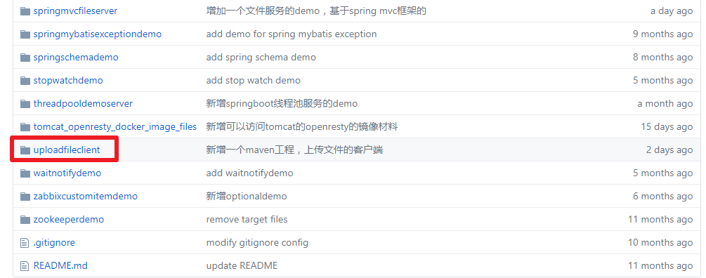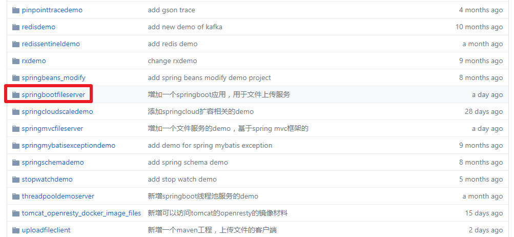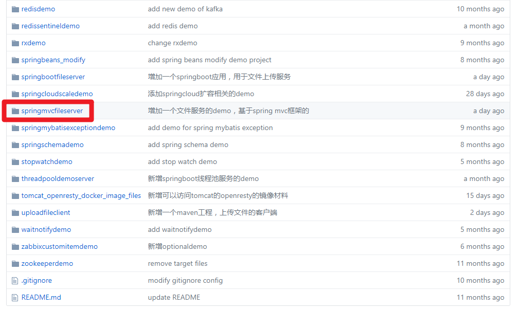文中提到的demo工程,您可以在GitHub下载,地址和链接信息如下表所示: 名称 链接 备注 项目主页 https://github.com/zq2599/blog_demos 该项目在GitHub上的主页 git仓库地址(https) https://github.com/zq2599/blog_demos.git 该项目源码的仓库地址,https协议 git仓库地址(ssh) git@github.com:zq2599/blog_demos.git 该项目源码的仓库地址,ssh协议 这个git项目中有多个目录,本次所需的资源放在springmvcfileserver,如下图红框所示: